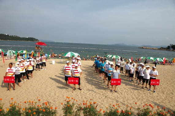 比賽越來(lái)越精彩,競(jìng)爭(zhēng)越來(lái)越激烈。最后一個(gè)項(xiàng)目是障礙接力。這項(xiàng)比賽刺激好玩,氣氛活躍,觀賞性強(qiáng),對(duì)運(yùn)動(dòng)員的個(gè)人體能及技術(shù)提出了較高的要求,對(duì)團(tuán)隊(duì)協(xié)作完成任務(wù)的能力也是一個(gè)考驗(yàn)。隨著主持人一聲令下,運(yùn)動(dòng)員們迅速奔向海邊取水,不顧“濕身”,控制好的就來(lái)個(gè)“蜻蜓點(diǎn)水”,控制稍遜的就直接和大海來(lái)個(gè)“擁抱”。返回的時(shí)候是要吃點(diǎn)苦頭的,面對(duì)不足一米高的障礙網(wǎng),有匍匐前進(jìn)的,有奮力爬行的,有蹲著挪移的,“洋相”盡出,令人捧腹。賽場(chǎng)上高潮迭起,戰(zhàn)火彌漫,場(chǎng)邊觀眾笑聲、加油聲、歡呼聲、喝彩聲響成一片,熱鬧非凡。經(jīng)過(guò)激烈的角逐,企業(yè)一隊(duì)拔得頭籌,公司一隊(duì)、公司二隊(duì)、企業(yè)二隊(duì)分獲二、三、四名。
