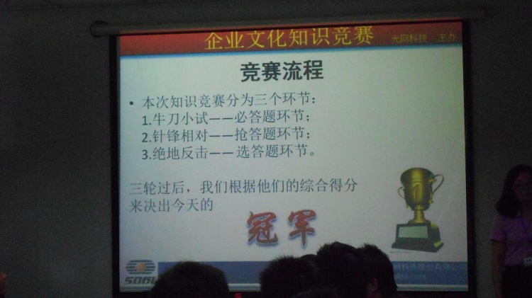 此次競賽分為必答題、搶答題、選答題、觀眾有獎競答、頒獎、特發(fā)信息企業(yè)文化有獎?wù)魑谋荣惖谝幻弥餍x佳作、公司領(lǐng)導(dǎo)賽后總結(jié)7個環(huán)節(jié)。