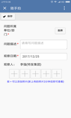 員工在集團(tuán)所屬所有經(jīng)營和租賃場所發(fā)現(xiàn)人的不安全行為、物的不安全狀態(tài)、環(huán)境的不安全因素等問題,可登錄“深圳特發(fā)集團(tuán)”企業(yè)微信號(見圖1)隨手拍模塊進(jìn)行上報(見圖2、3),上報內(nèi)容包括問題所屬單位/部門(可在模塊中選擇)、問題的描述及問題照片,所有信息填報完成后點擊保存,信息將自動導(dǎo)入安全生產(chǎn)信息系統(tǒng),上報至問題所屬企業(yè)安委辦負(fù)責(zé)人。