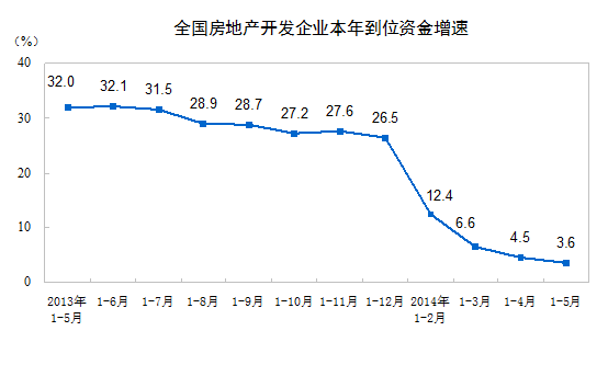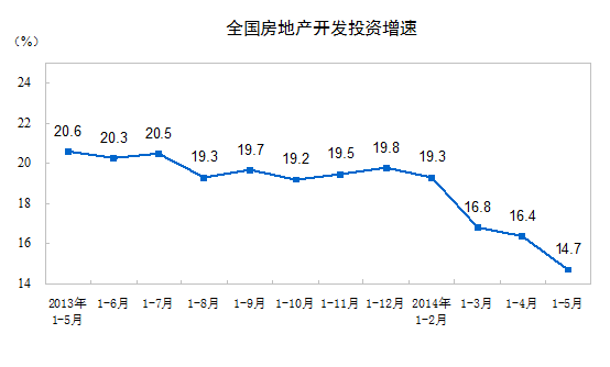 2014年1-5月份,全國房地產(chǎn)開發(fā)投資30739億元,同比名義增長14.7%,增速比1-4月份回落1.7個百分點。其中,住宅投資21043億元,增長14.6%,增速回落2個百分點,占房地產(chǎn)開發(fā)投資的比重為68.5%。