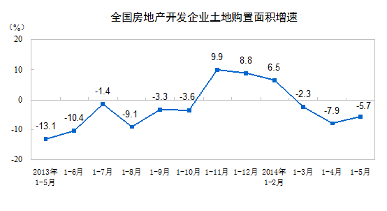 1-5月份,房地產(chǎn)開發(fā)企業(yè)土地購置面積11090萬平方米,同比下降5.7%,降幅比1-4月份收窄2.2個百分點;土地成交價款2954億元,增長8.7%,增速回落0.9個百分點。