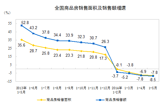 1-5月份,商品房銷售面積36070萬平方米,同比下降7.8%,降幅比1-4月份擴大0.9個百分點。其中,住宅銷售面積下降9.2%,辦公樓銷售面積下降5.8%,商業(yè)營業(yè)用房銷售面積增長0.6%。商品房銷售額23674億元,下降8.5%,降幅比1-4月份擴大0.7個百分點。其中,住宅銷售額下降10.2%,辦公樓銷售額下降14.0%,商業(yè)營業(yè)用房銷售額增長2.5%。